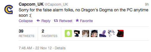 Capcom confirmó a Eurogamer que todo fue un error – al parecer el Community Manager se descuidó y olvidó escribir un ‘no’ al principio de la frase y que «actualmente no tenemos planes para una versión para PC de Dragon’s Dogma,» aseguró un representante de Capcom.