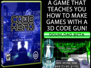 Code Hero podría describirse como «el juego que te enseña a programar videojuegos» y funciona mediante el uso de un «3D Code Gun» con la cual los jugadores deberán apuntar y acertar para poder programar