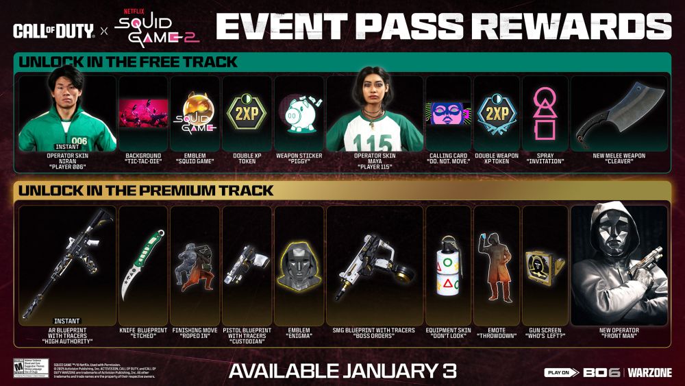 Consiguiendo XP en Multijugador, Zombis o Warzone ganarás recompensas en el Pase de Evento de El juego del calamar que es gratuito para todos los jugadores y que incluye la recompensa instantánea del diseño de operador «Jugador 006» y otros desbloqueables como el diseño de operador «Jugador 115», fichas de XP Doble y más elementos con temática de la serie.
