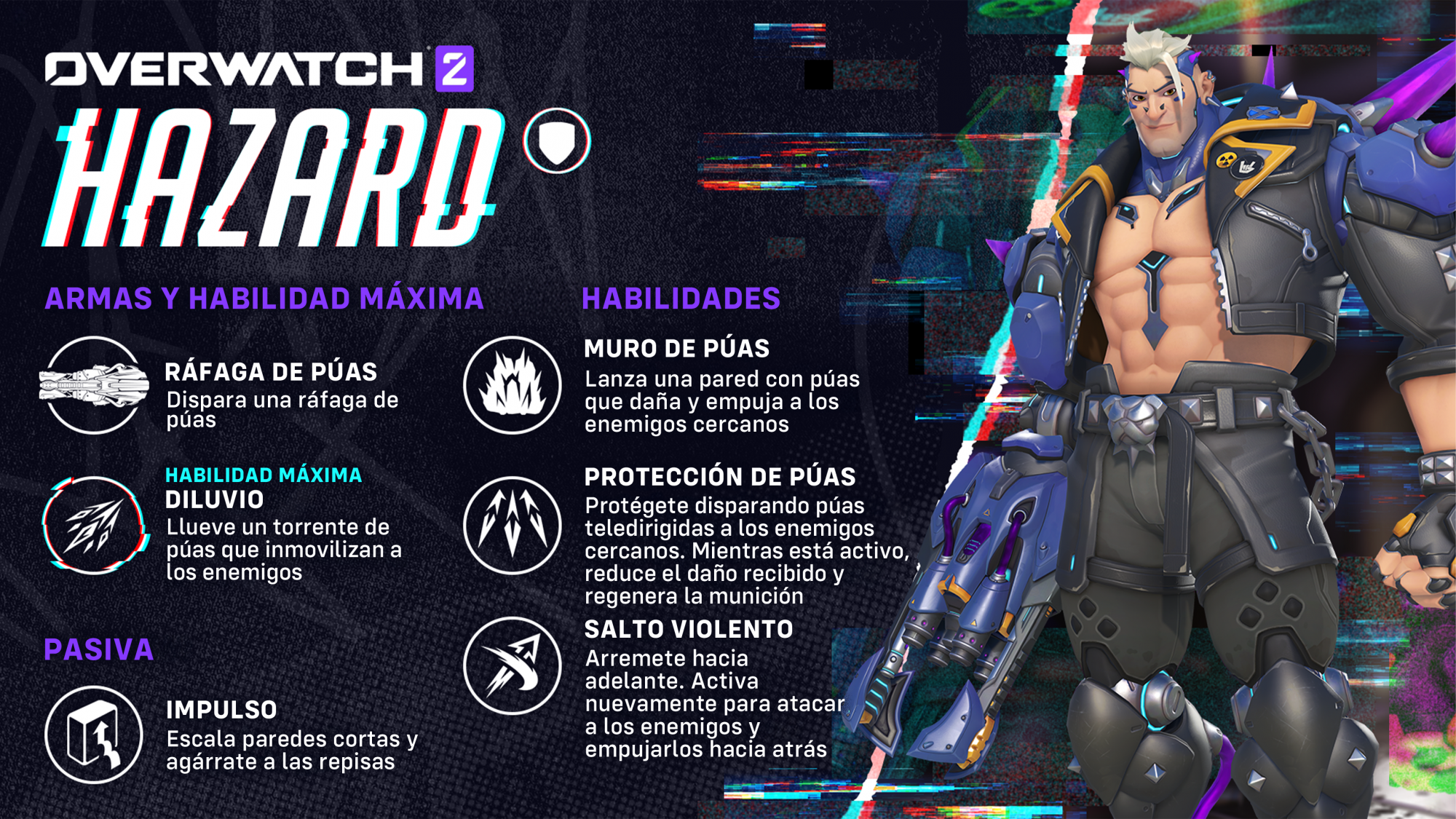 El estilo de juego de Hazard es una combinación basada en el movimiento entre los estilos de inmersión y de pelea que hará que tus rivales corran a buscar refugio. Su kit general se basa en habilidades que refuerzan su movilidad: Muro de púas y Salto violento. Podrás quedarte en la retaguardia para atacar a héroes con poca salud, pero podrás adelantarte rápidamente al frente para mantener bajo control al tanque rival.
