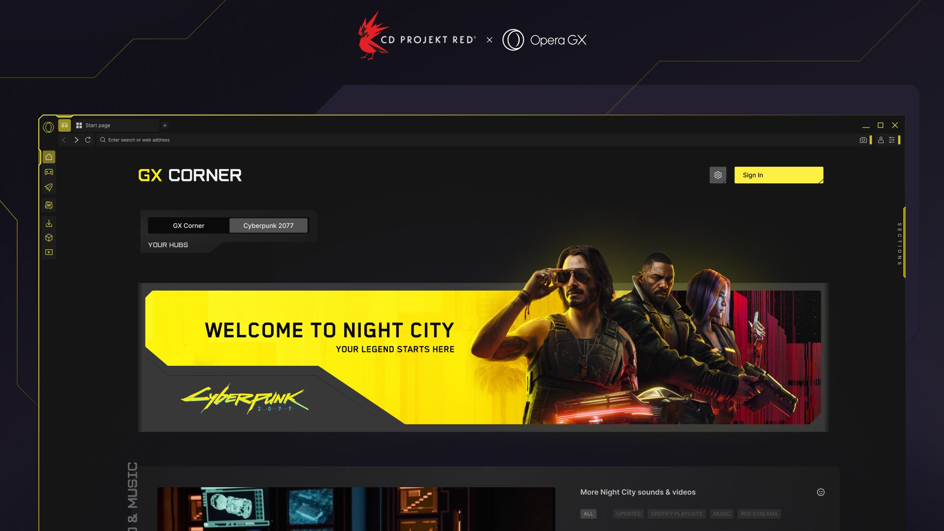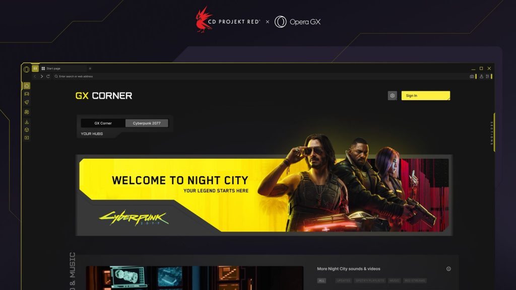 Comenzando con el hub de Cyberpunk 2077, esta nueva incorporación a Opera GX acerca a los jugadores a sus títulos favoritos como nunca antes, lo cual les permite usar la web sin salir de Night City. Ahora pueden navegar con la banda sonora completa de Cyberpunk 2077 en el fondo, tener páginas web mostradas en el estilo visual distópico de Cyberpunk 2077 y obtener acceso directo a livestreams, guías de modding, noticias del juego y mucho más, todo dentro de la interfaz del navegador.