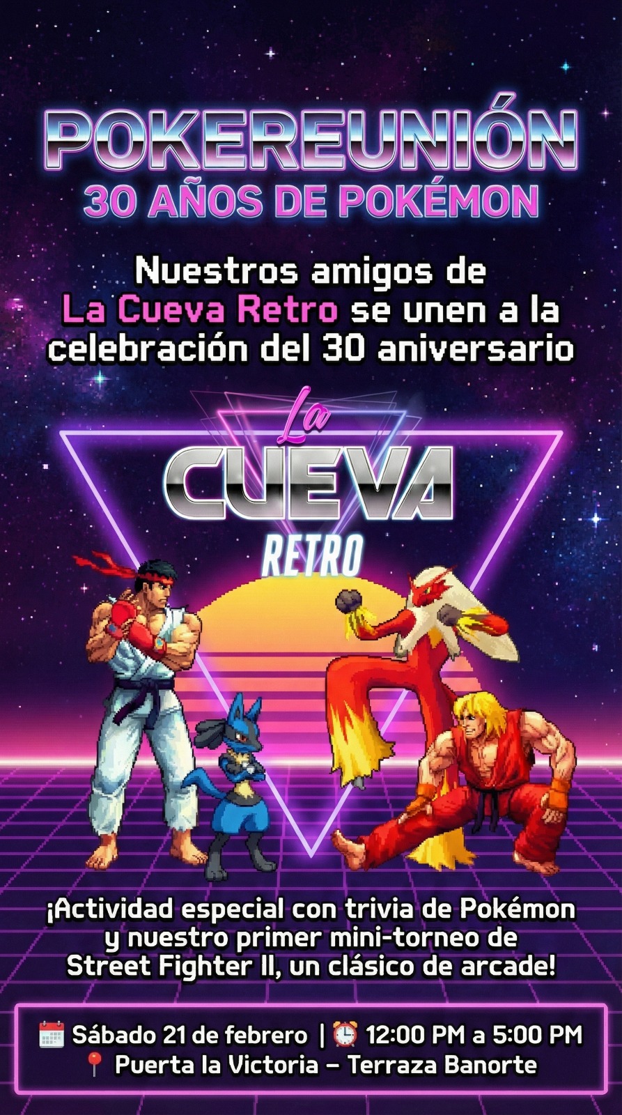 ¡Contaremos con trivias relacionadas con pokémon así que a estudiar! Al igual que el primer mini torneo de Street fighter II al estilo de arcade, así que ¡prepárense para un viaje en el tiempo y compitan! Es el Sábado 21 de Febrero en Puerta la Victoria – Terraza Banorte de 12 PM a 5 PM en Querétaro. ¡Nos vemos ahí!